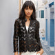 Yaprak deseninde kesilmiş gerçek deri parçalarının kendinden esneyen -likrasız- giyimlik tül üzerine dikilmesi ile üretilen kadın ceketimiz.